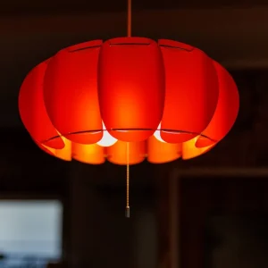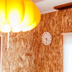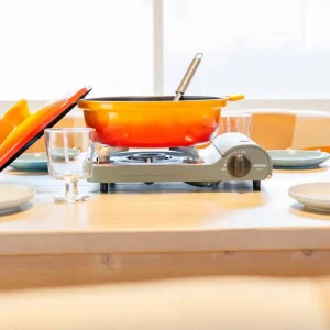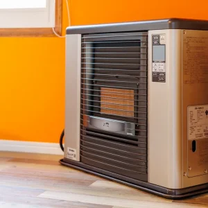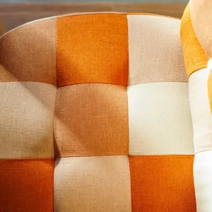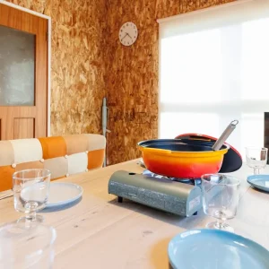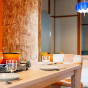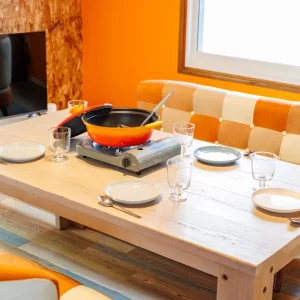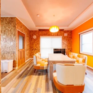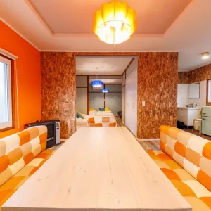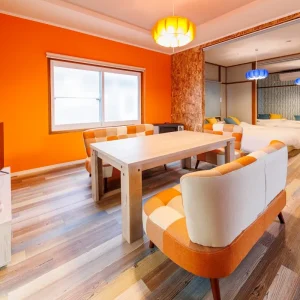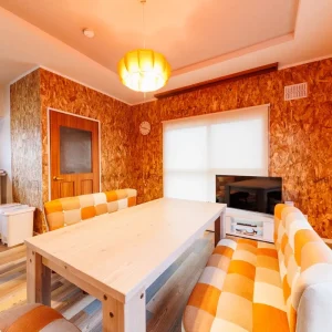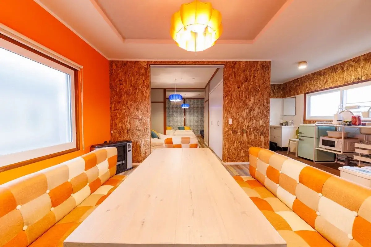 オレンジを基調としたリビングは5人でゆっくり過ごせるダイニングテーブルとソファを完備。