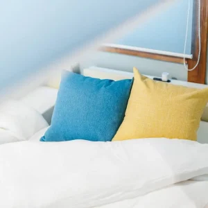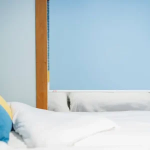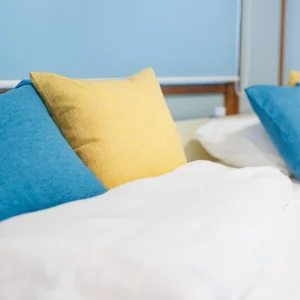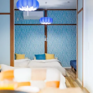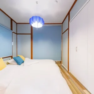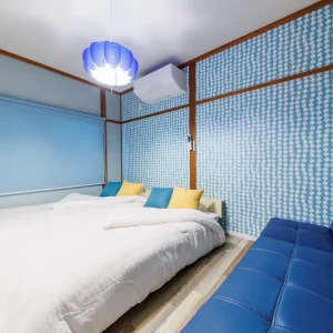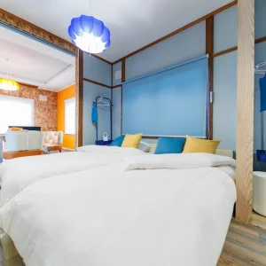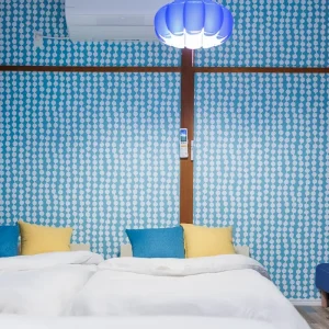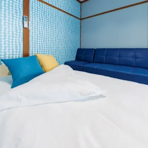 青を基調とした清潔感のある寝室は、肌触りの良いリネンと程よい硬さのマットレスで心地よい眠りをお約束します。