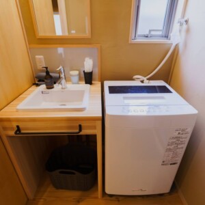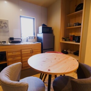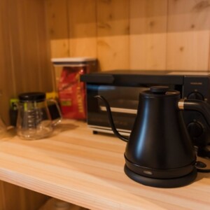 9坪のコンパクトな設計ながら、大きな吹き抜けによる広がりが感じられる一体感のある空間です。1階にはリビングルームとキッチン、2階には4名様まで宿泊可能なベッドルームをご用意しています。